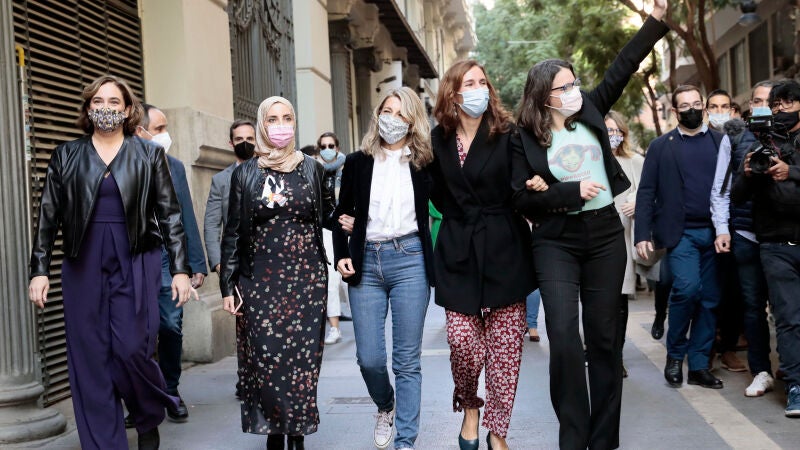 La ministra de Trabajo, Yolanda Díaz, la vicepresidenta del Gobierno valenciano, Mónica Oltra, la alcaldesa de Barcelona, Ada Colau, la líder de Más Madrid, Mónica García, y la portavoz del MDyC en Ceuta, Fátima Hamed han llegado este sábado al encuentro 'Otras Políticas' en Valencia en medio de protesta de transportistas, que les han increpado e impedido el paso hacia el teatro durante unos minutos, mientras los asistentes al encuentro aplaudían.
