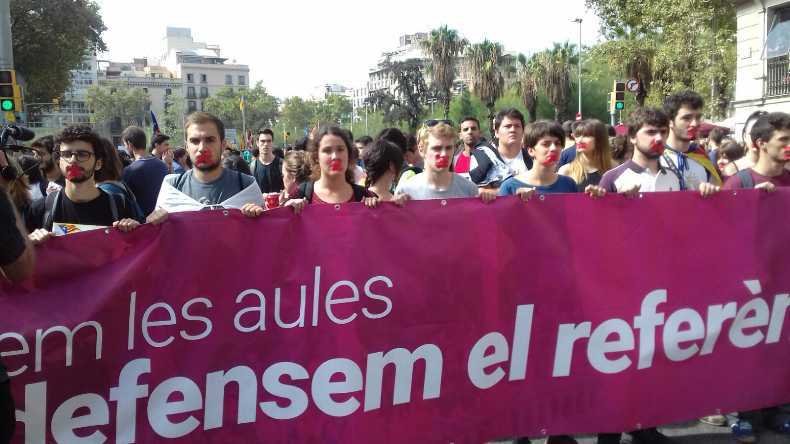 En la plaza de la Universidad se han producido momentos de tensión entre manifestantes y algunos medios de comunicación, que han sido acusados de manipular la información que transmiten de lo que está ocurriendo en Cataluña. Tras una media hora, los concentrados en la plaza de la Universidad han iniciado una marcha hasta la plaza de Cataluña, a la que han llegado más estudiantes procedentes de otras universidades. Muchos jóvenes llevaban esparadrapos rojos cruzados tapando sus labios, en protesta por lo que entienden que es una la falta de libertad de expresión.
