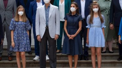 Los reyes Felipe y Letizia y sus hijas, la princesa Leonor (i) y la infanta Sofía (d), durante la recepción que han ofrecido este jueves en Barcelona a los premiados de la Fundación Princesa de Girona de 2021 y 2020, año en el que no se pudieron entregar los premios debido a la pandemia de coronavirusEfe