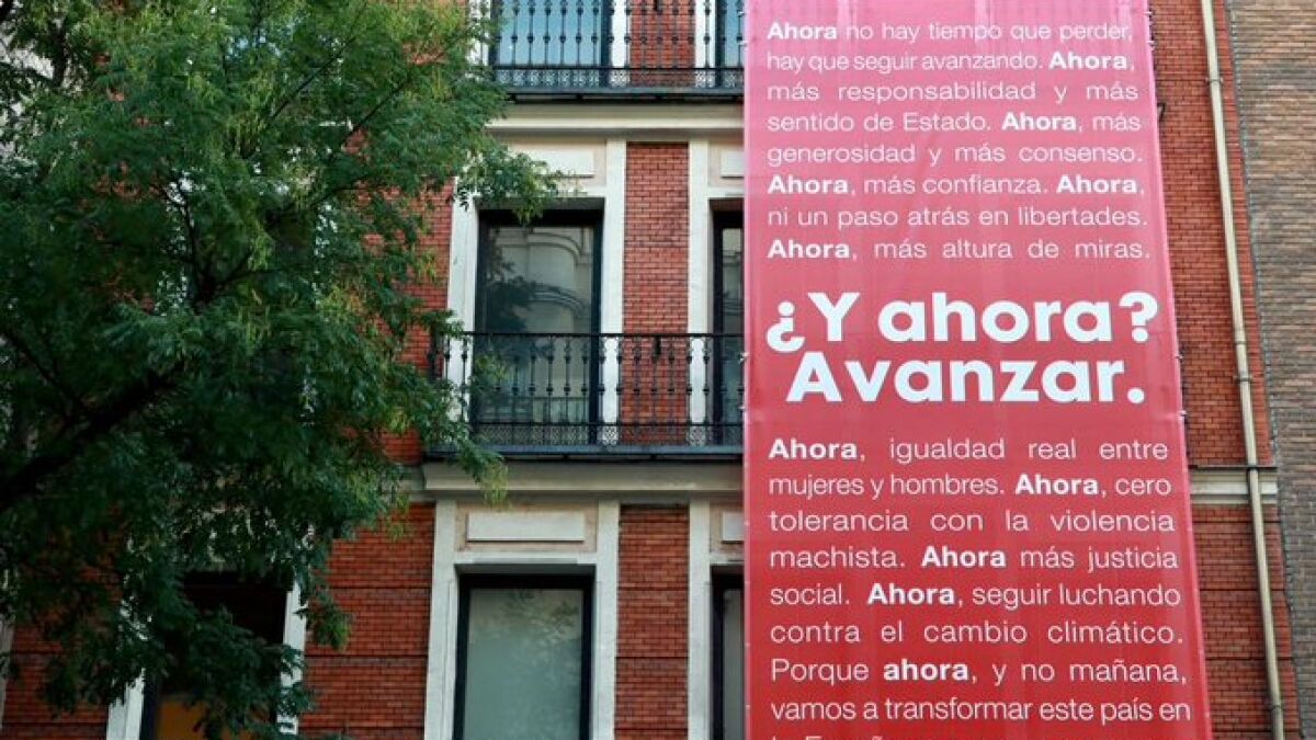 "Ahora no hay tiempo que perder, hay que seguir avanzando", dice el cartel que, con fondo rojo y letras blancas, recorre de arriba a abajo tres alturas del número 70 de la madrileña calle Ferraz y que ha sido colgado a 48 horas de que en este mismo lugar se celebre el Comité Electoral del PSOE, que marcará la estrategia de campaña.