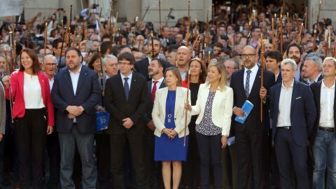 El president ha dado este discurso junto a la alcaldesa de Barcelona, Ada Colau, tras recibir ambos en la plaza de Sant Jaume de Barcelona a los más de 700 alcaldes catalanes que han sido citados por la Fiscalía por firmar un decreto de apoyo político al referéndum del 1 de octubre.