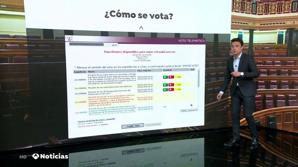 Los diputados ven en la pantalla las preguntas a un lado y al otro, el voto por colores: Verde, para votar 'Sí'; el rojo es 'No'; y amarillo para la abstención. Más tarde le deben dar a 'Emitir voto' y aparece una segunda pantalla para confirmarlo. Por lo tanto, si se han equivocado, pueden corregirlo. Después, de esta doble confirmación, le dan a finalizar y el sistema emite un justificante con lo que se ha votado.