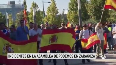 Los manifestantes que se han congregado este domingo en los alrededores del pabellón Siglo XII, donde se celebra la 'Asamblea por la fraternidad, la convivencia y las libertades' de Unidos Podemos, han lanzado una botella a la presidenta de las Cortes de Aragón, Violeta Barba.