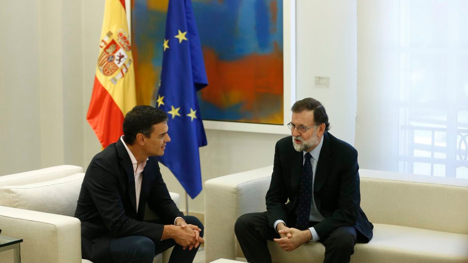 El presidente del Gobierno, Mariano Rajoy, ha apelado a la unidad de los partidos constitucionalistas y a la defensa del Estado de derecho en la reunión que ha mantenido en el Palacio de la Moncloa con el líder del PSOE, Pedro Sánchez, y que ha durado casi hora y media.