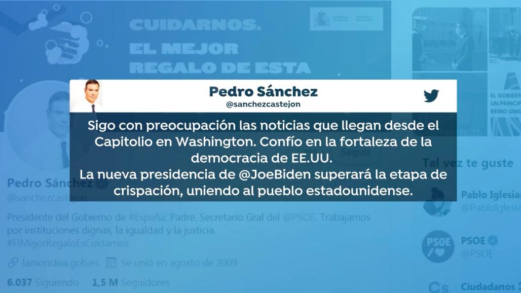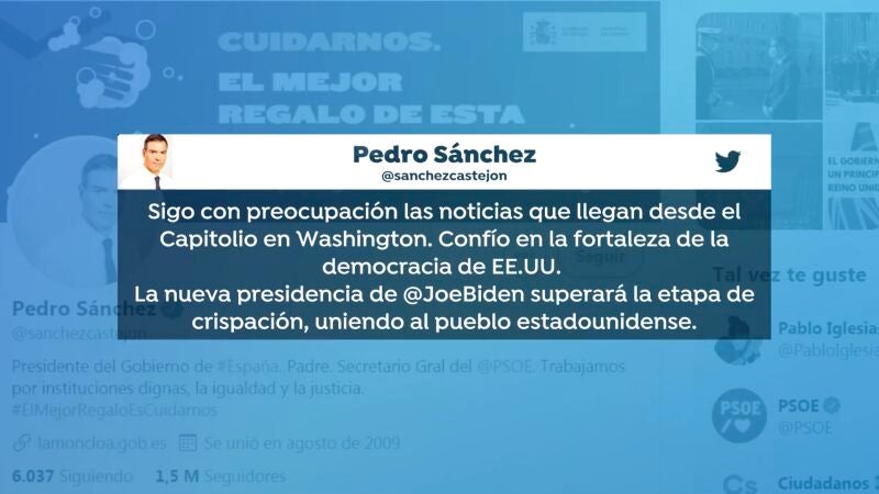El presidente del Gobierno, Pedro Sánchez, ha manifestado su apoyo a Joe Biden tras el asalto al Capitolio y la victoria del demócrata en las elecciones estadounidenses. "El ataque de ayer al Capitolio solo ha logrado reforzar los principios que compartimos. España trabajará con Estados Unidos por un mundo más justo y el triunfo de la democracia", escribe en Twitter.