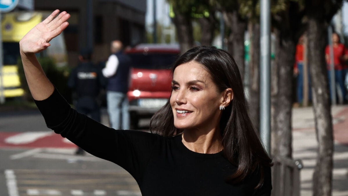 En la parte superior, la reina Letizia combinaba la falda con una camiseta negra ajustada de manga larga y un bolso negro.