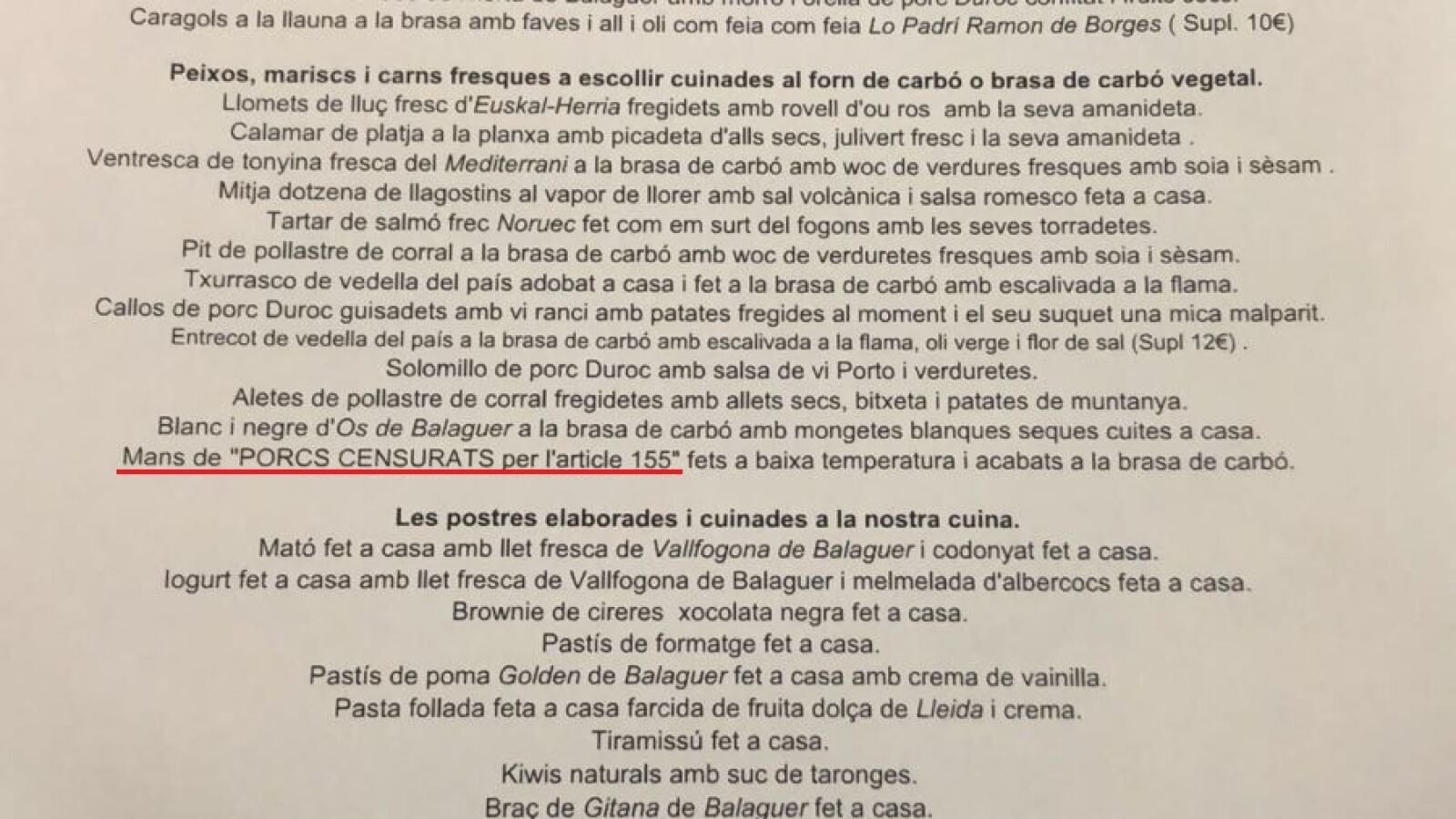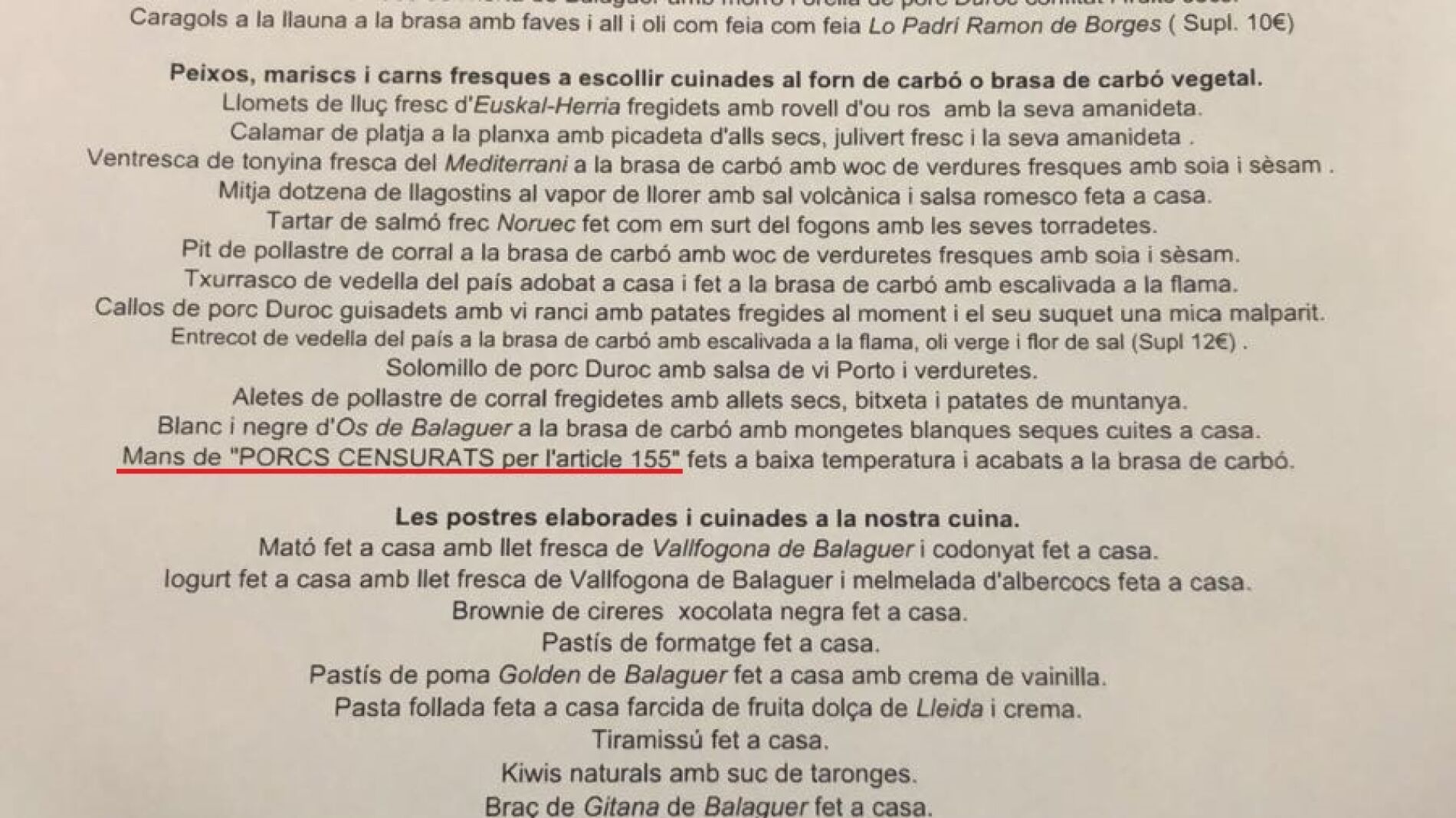 El restaurante de Lleida reincide con otro polémico menú: hay 'manos de cerdos censurados por el articulo 155' entre los segundos
