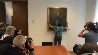 El momento en el que se ha descolgado el cuadro ha sido captado por Navarra televisión y un trabajador de la Cámara de Navarra ha procedido a la retirada delante de las cámaras y sin ninguna presencia de representantes políticos.