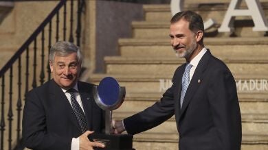 En su primera intervención pública desde el anuncio de disolución de ETA, Felipe VI ha incluido en el discurso de entrega del Premio Carlos V al presidente del Parlamento Europeo, Antonio Tajani, estas palabras sobre el terrorismo, una amenaza que "ha seguido golpeando" a las sociedades europeas "y a otros países del mundo, atentando contra la vida, la dignidad y la libertad de los ciudadanos".