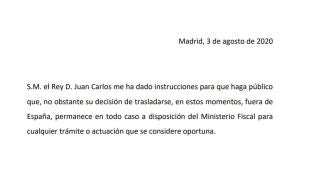 Este comunicado se ha hecho público después de que la Casa Real informara de que el rey Juan Carlos ha trasladado a Felipe VI su "meditada decisión" de trasladarse a vivir fuera de España. Este anuncio se produce después de que se hayan hecho públicas informaciones relacionadas con sus cuentas en Suiza y los audios de conversaciones de la examiga íntima del rey Juan Carlos, Corinna Larsen. Precisamente, ella tendrá que declarar el próximo 8 de septiembre en la Audiencia Nacional por la pieza 'Carol' del 'caso Villarejo'.