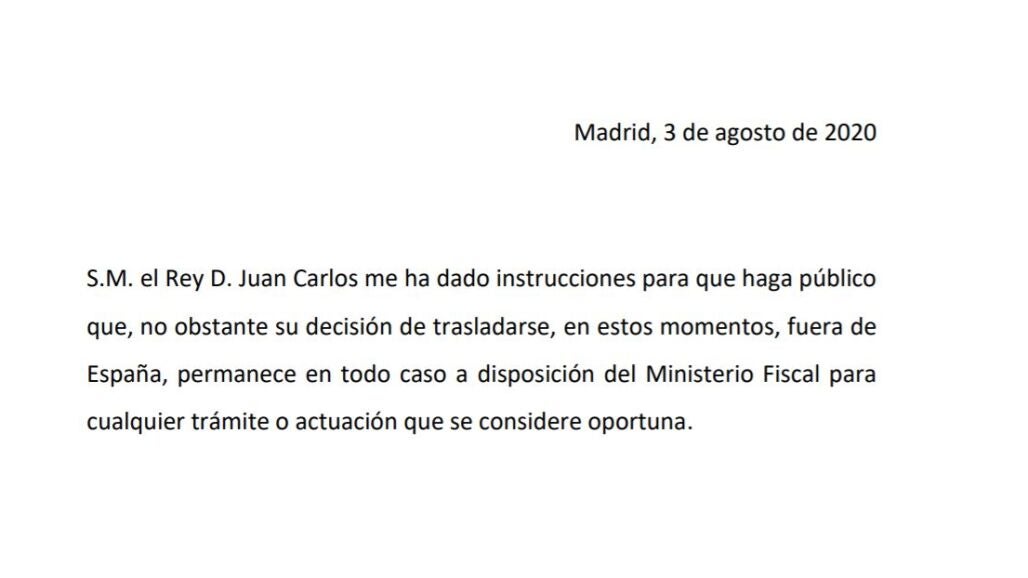 A través de sus abogados, el Rey emérito ha querido transmitir que "permanece en todo caso a disposición del Ministerio Fiscal para cualquier trámite o actuación que se considere oportuna".