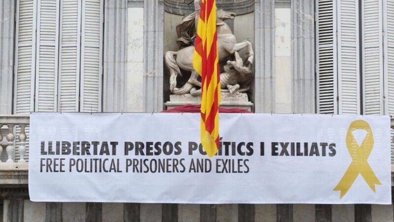 La foto es antigua pero esa pancarta estuvo colgada de la fachada del Parlamento Catalán pese a la orden de la Junta Electoral Central (JEC) para que la retirara, y por ese motivo, fue condenado a un año y medio de inhabilitación por un delito de desobediencia. Hoy el Supremo revisará esa condena.