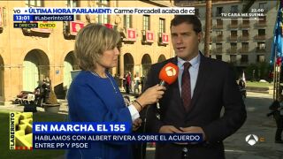 Albert Rivera se ha mostrado satisfecho de que el PSOE "haya rectificado" y haya aceptado un acuerdo con el Gobierno para aplicar el artículo 155. Además ha lamentado que Carmen Calvo se haya "adelantado" al anunciar que habrá elecciones en Cataluña el próximo mes de enero.
