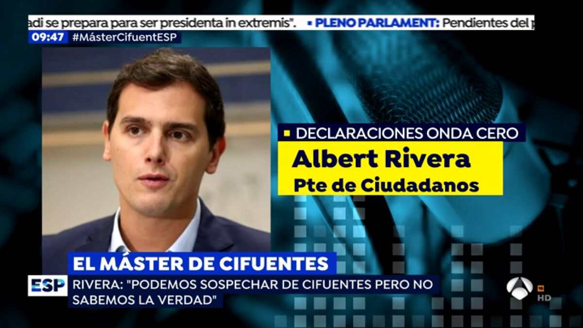 El líder de la formación naranja, Albert Rivera, ha dicho en Onda Cero en el programa Más de uno que "ahora hay dos verdades, la de Cifuentes y la de un periódico digital". Precisamente con el argumento de que "con los elementos que tenemos encima de la mesa podemos sospechar de Cristina Cifuentes, lo que no podemos decir hoy es que sepamos la verdad" considera que la moción de censura en estos momentos no es lo que procede.