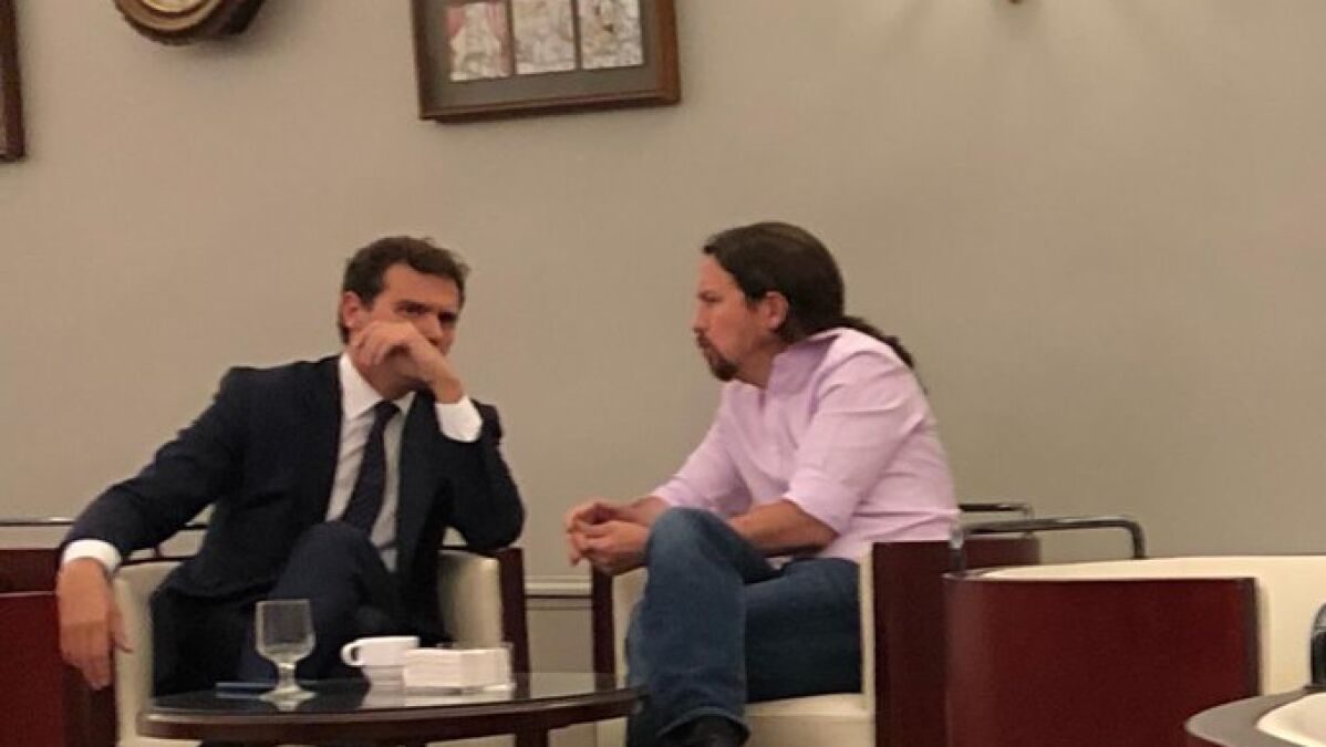El presidente de Ciudadanos, Albert Rivera, y el líder de Podemos, Pablo Iglesias, compartieron esta tarde confidencias, desde las 19:50 hasta las 20:15 horas, en la cafetería del Hemiciclo mientras Pablo Casado comparecía en rueda da de prensa y Pedro Sánchez estaba en el Palacio de la Moncloa a su regreso de Zarzuela.