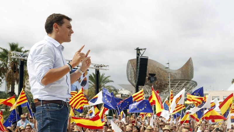 El presidente de la formación naranja ha protagonizado, junto con la líder del partido en Cataluña, Inés Arrimadas, un acto en Barcelona favor de la "neutralidad de los espacios públicos", organizado por la plataforma España Ciudadana -impulsada por el partido de Rivera- bajo el lema 'El amor es más fuerte que el odio.¡No nos callarán'.