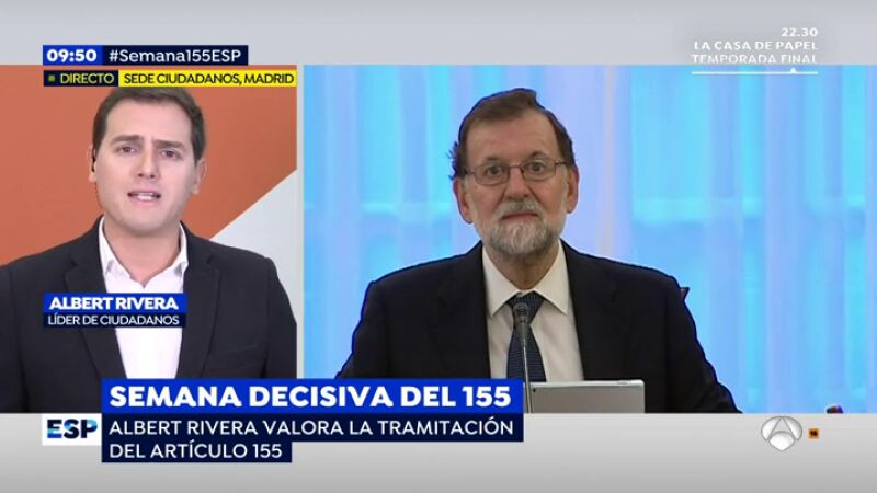 Albert Rivera ha señalado que, desde Ciudadanos, se conforman "con que se actúe y con poner urnas". Ha reiterado que apoyará "la aplicación de la Constitución", en referencia al artículo 155, y confiará al "Gobierno su ejecución".