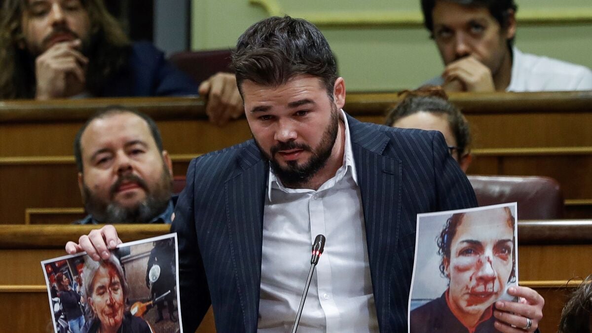 "¿Cree usted que es agradable tender la mano a los responsables de esto?, ha preguntado Rufián mientras mostraba las fotografías de dos agredidas el pasado 1-O, ¿Cree usted que es fácil tender la mano a quienes mandaron a salvajes a las calles de Cataluña para apalear a nuestra gente? La respuesta es no".