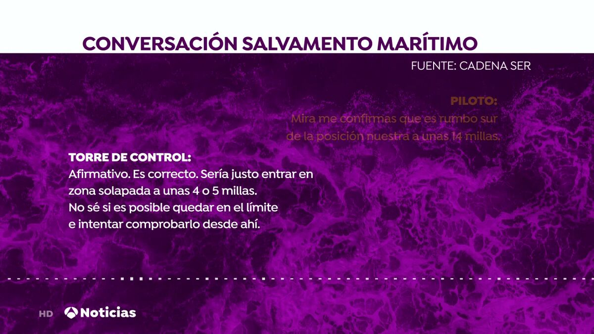 Los audios de la conversación, publicados por la SER, comienzan el pasado martes sobre las 16h de la tarde. El centro de coordinación de Las Palmas habla con el piloto del avión de búsqueda: "Mira, te voy a dar una posición, nos gustaría ver si podría comprobarlo sin llegar a entrar en zona SAR marroquí". "De acuerdo, adelante", responde el piloto.