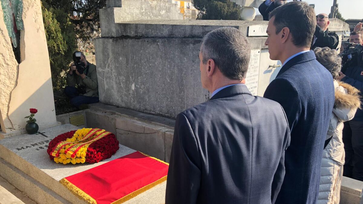 Lo ha hecho junto a familiares de Azaña y las ministras de Educación e Interior, Isabel Celáa y Dolores Delgado. Tras esta primera parada, Sánchez se trasladará a la localidad de Colliure, en el sureste francés, para visitar la tumba del poeta Antonio Machado.