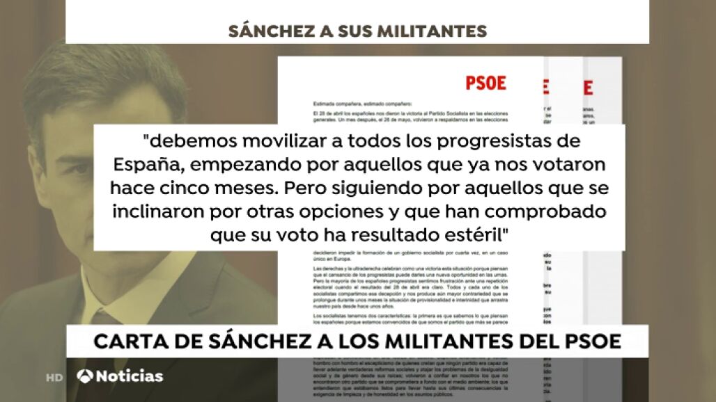 En una carta a los militantes socialistas difundida por el PSOE, Sánchez pide "movilizar a todos los progresistas" de España, tanto a aquellos que votaron al partido hace cinco meses como a aquellos que "se inclinaron por otras opciones y han comprobado que su voto ha resultado estéril y sólo ha servido para prolongar el bloque y la inestabilidad" del país.