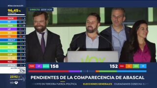 El líder de Vox ha dicho que la subida de escaños de Vox, de 28 a 52, "ha sido la mayor gesta de la democracia española", tras lo que los asistentes le han gritado 'presidente'. Abascal, entonces ha respondido a los presentes diciendo que "todavía no, aún hay que trabajar mucho".