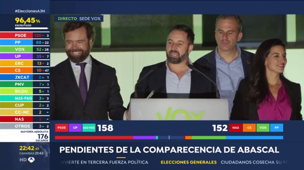 "Quiero mandar un mensaje de gratitud a los 3,5 millones de españoles que han confiado en nosotros. Pero sobre todo quiero prometer: "No defraudaremos, no daremos un paso atrás y defenderemos todo lo que hemos defendido en las Cortes españolas", ha dicho Santiago Abascal en el balcón de la sede de Vox, donde ha comparecido acompañado de Javier Ortega Smith, Rocío Monasterio e Iván Espinosa de los Monteros.