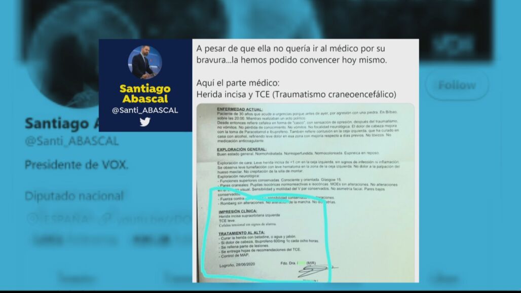 A esta contundente afirmación ha contestado el líder de Vox, Santiago Abascal, que ha publicado en su cuenta de Twitter, el parte médico, fechado en Logroño, de la diputada de su partido.