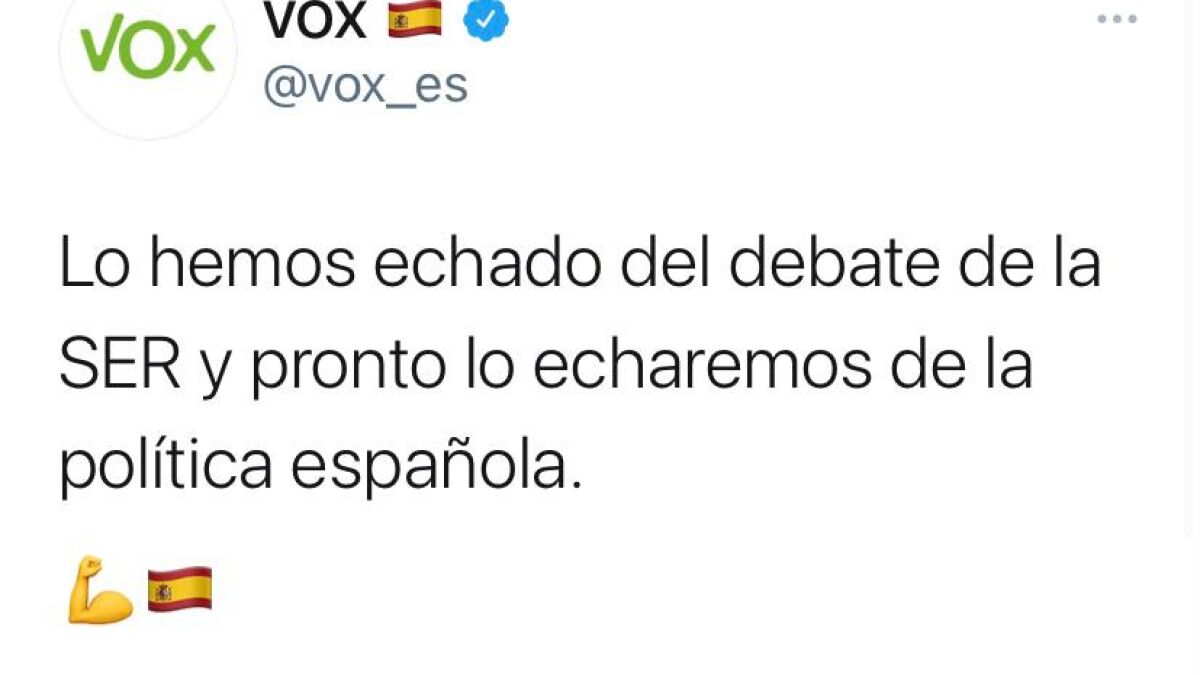 Pablo Iglesias comenzó el debate de las elecciones a la Asamblea de Madrid exigiendo a Rocío Monasterio que condenara las amenazas de muerte que ha recibido junto al ministro del Interior Fernando Grande-Marlaska y la directora de la guardia civil, María Gámez. Empezó entonces un duro rifirrafe que provocó la marcha del líder de Unidas Podemos y ya marcó todo el debate electoral del 4M hasta que fue finalizado antes de tiempo. Desde sus cuentas de Twitter tanto Vox como Santiago Abascal y Rocío Monasterio han presumido de la marcha de Iglesias: "Lo hemos echado del debate de la SER y pronto lo echaremos de la política española". Idéntico tuit colgaba Rocío Monasterio.