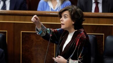 La número dos del Gobierno le ha echado en cara a Domènech que pida un referéndum para volver a la "casilla de salida" o que exija una negociación bilateral ahora, después de que lo hayan reclamado las dirigentes de ERC, Marta Rovira, y del PDeCAT, Marta Pascal. "Y pide hasta un pacto de claridad, más vale que se lo apliquen a ustedes, que se hagan un test de claridad en Podemos, a ver si se aclaran entre el señor Iglesias, la señora Bescansa, el silente Errejón y usted mismo", ha enfatizado la número dos del Ejecutivo.