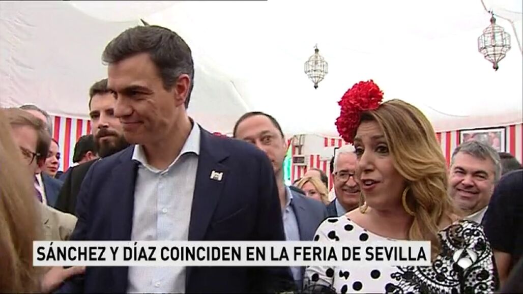 Díaz y Sánchez se han saludado en la caseta de la Asociación de la Prensa de Sevilla, donde han asistido juntos a la entrega de los tradicionales 'claveles' que concede anualmente esta institución y que este año distinguen a la bailaora y coreógrafa Matilde Coral; el humorista, actor y presentador Manu Sánchez y a la asociación Danza Mobile, entidad dedicada al desarrollo integral de personas con diversidad funcional a través de las artes.