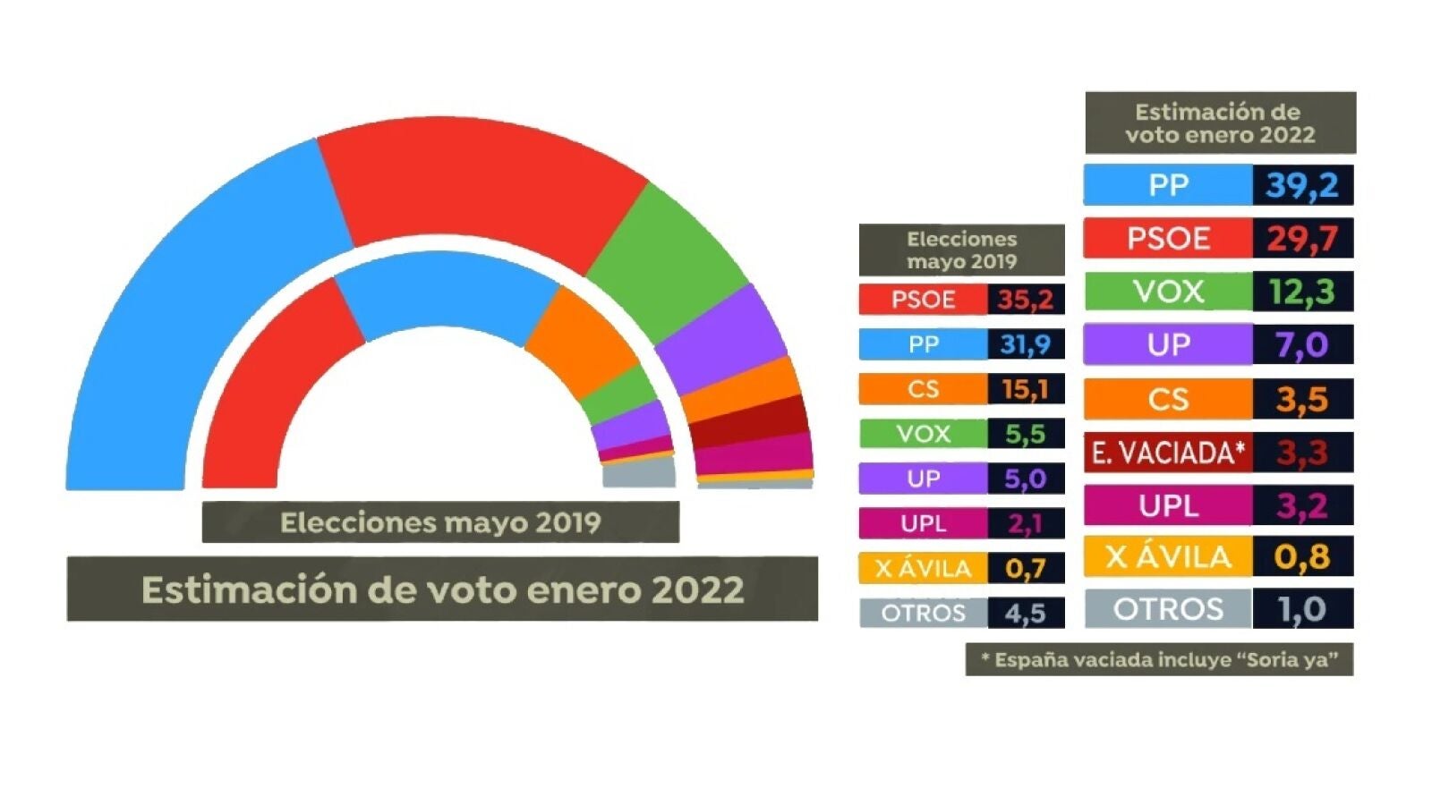Una encuesta de NC Report para La Razón publicada el pasado 24 de enero situaba la victoria en las urnas del lado del PP con una horquilla de entre 36 y 38 parlamentarios. El partido de Mañueco quedaría entonces a una distancia entre 3 y 5 escaños de lograr la mayoría absoluta.