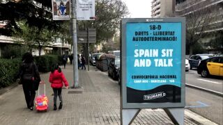 El movimiento a favor de la independencia ha conseguido piratear varios paneles publicitarios en Barcelona y colgar sus carteles en los que se pueden leer el lema "Spain sit and talk".