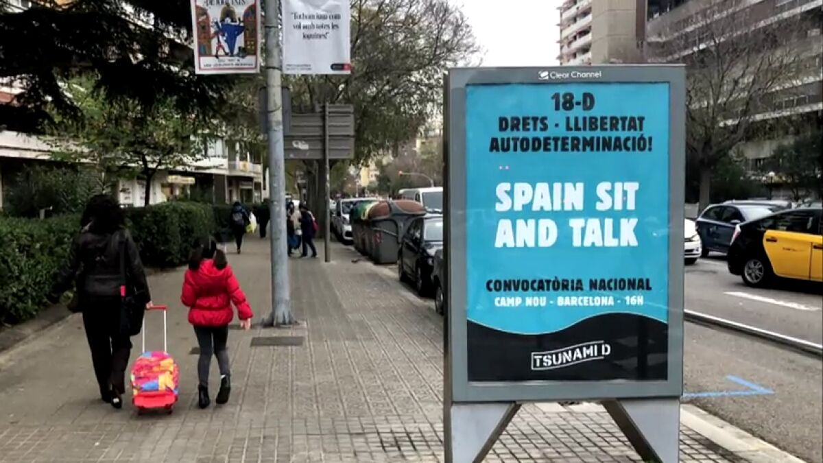 La ciudad de Barcelona ha amanecido esta mañana con dos de sus marquesinas publicitarias ocupadas por propaganda del movimiento Tsunami Democràtic. En ellas se puede leer el lema "Spain sit and talk" (España, siéntate y habla) y convocan a una manifestación para este miércoles 18 de diciembre en el Camp Nou a las 16h. con motivo del partido que enfrentará al Barcelona-Real Madrid, que se aplazó con motivo de los disturbios que hubo en la ciudad condal el pasado mes de octubre.