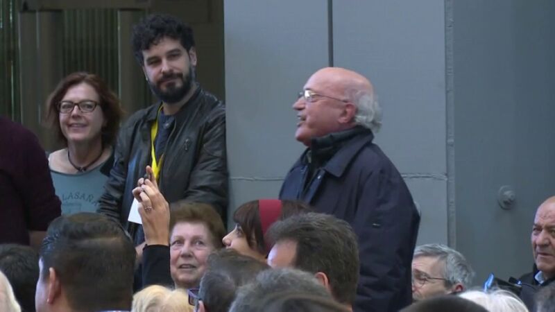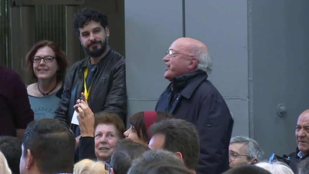 A ritmo de 'jota' un asistente al acto de presentación de Más Madrid, en el que han participado Íñigo Errejóny Manuela Carmena, ha querido sorprender a los candidatos.