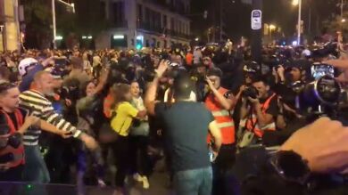 Un hombre se ha enfrentado a un grupo de personas, que se manifestaban en la vía Laietana, durante la noche del sábado para reprocharles que no dejaran a la policía hacer su trabajo.