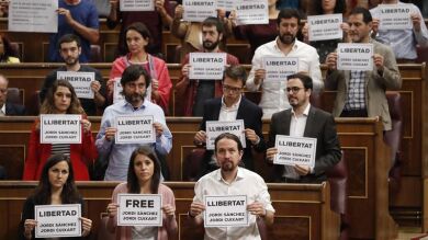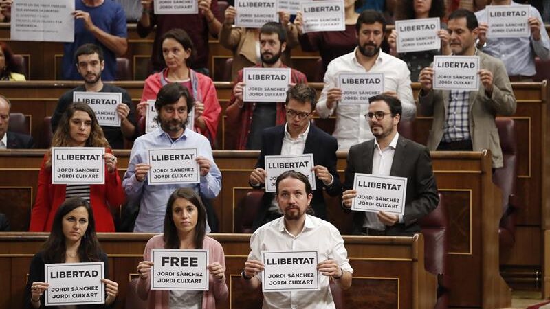 Unidos Podemos y PDeCat muestran carteles en apoyo a Sánchez y Cuixart: "Libertad, presos políticos"