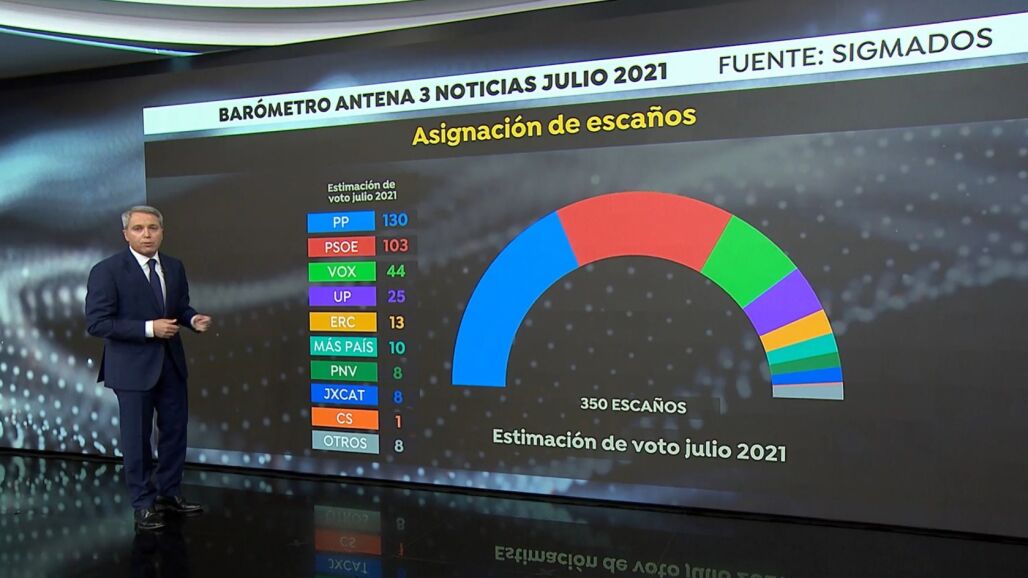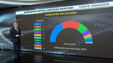 En cambio, Vox, la formación de Santiago Abascal baja con respecto al anterior barómetro. Con todo, "la suma de PP y Vox se quedaría a dos escaños de la mayoría absoluta", analiza Vicente Vallés. Por su parte, Podemos se mantienen en cuarto lugar y Ciudadanos "se queda por debajo del 3% de voto y no tendría representación parlamentaria".