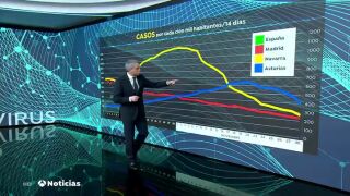 Laincidencia del coronavirus en España, que representa el número de contagios por cada 100.000 habitantes, ha bajado este martes 1 de diciembre a 265. Para entender esta evolución, Vicente Vallés compara las curvas de contagios en Madrid, Navarra y Asturias.