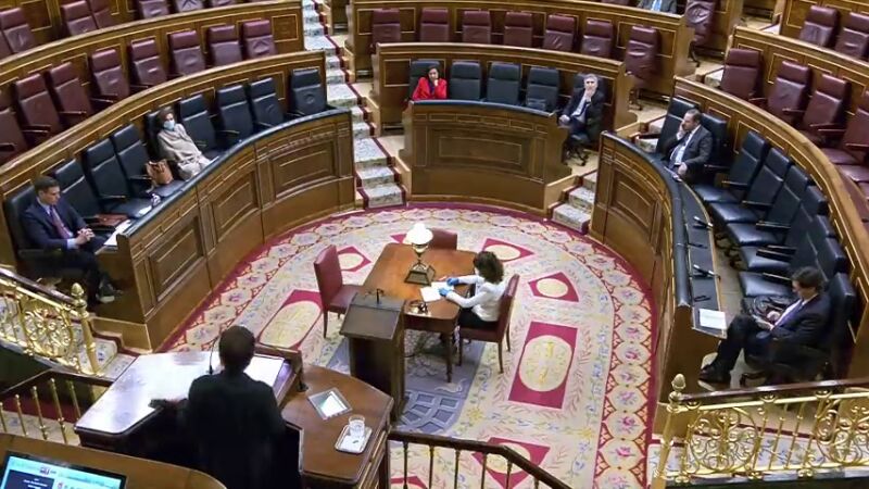 La vicepresidenta Carmen Calvo sigue el pleno del Congreso con mascarilla y tapada con una manta después de haber superado el coronavirus