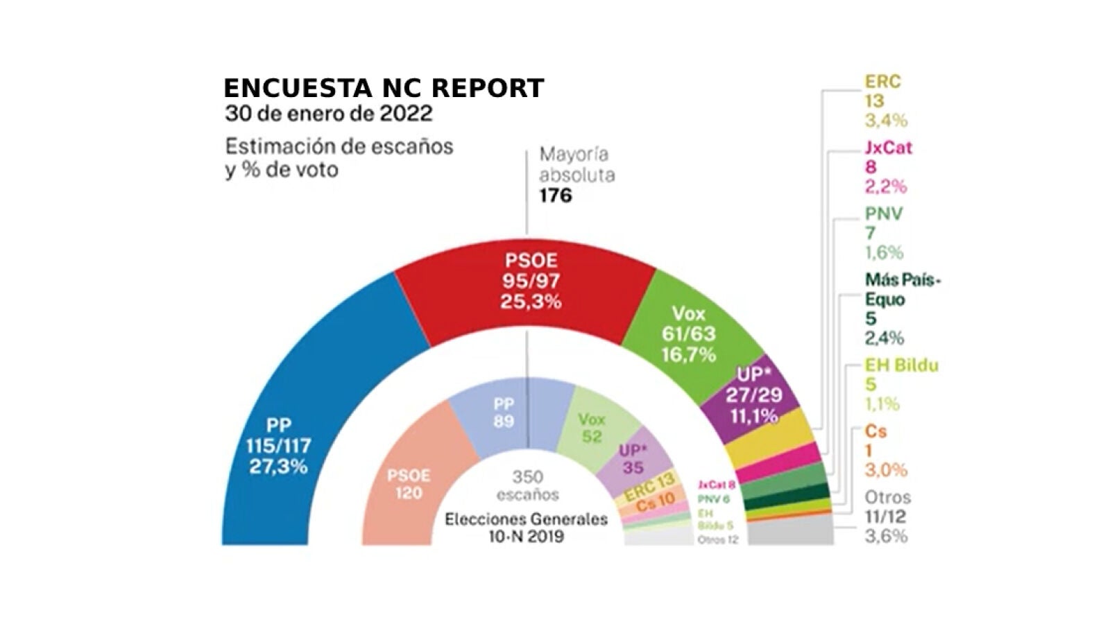Los populares perderían ocho escaños y los del partido que lidera Santiago Abascal, ganarían 10. Entre PP y Vox suman entre 176-180 escaños, por lo que podrían alcanzar la mayoría absoluta y entre PSOE y Podemos, 122-126.