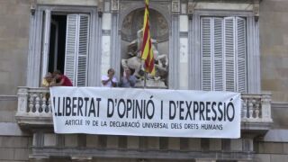 Vuelve la pancarta al balcón de la Generalitat, ahora reclamando libertad de expresión. Tres horas antes habían quitado la que ordenaba retirar el Tribunal Superior de Justicia de Cataluña.