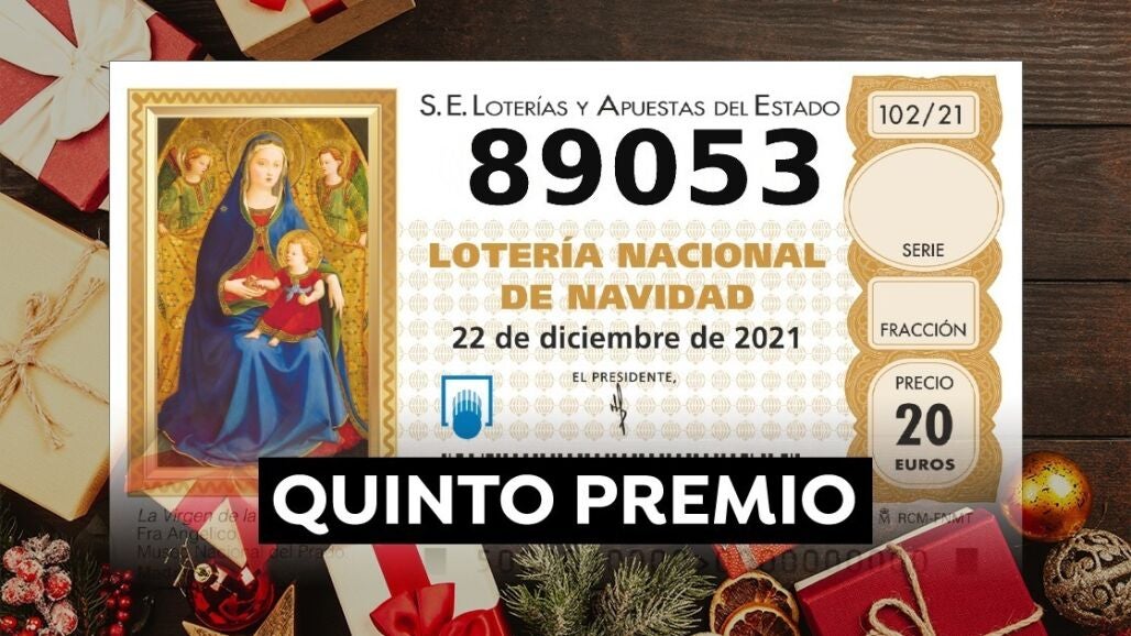 El 89.053 es el sexto quinto premio. Los quintos premios de la Lotería de Navidad reparten 60.000 euros a la serie, con 6.000 euros al décimo.