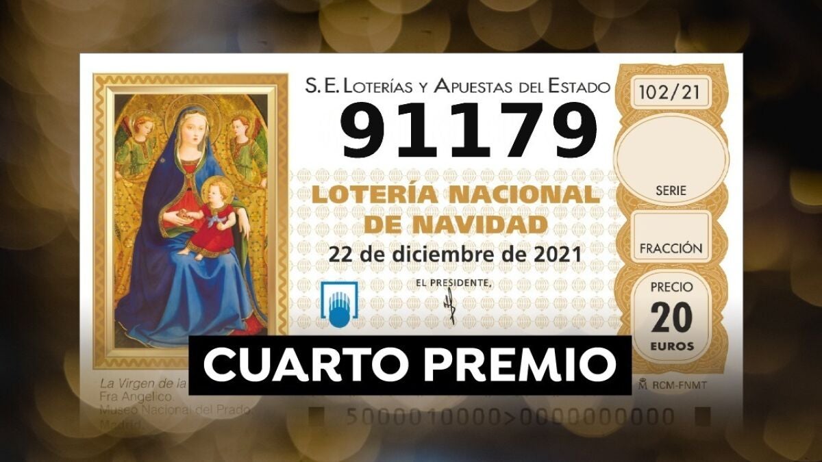 91.179 es el segundo cuarto premio de la Lotería de Navidad 2021. Los dos cuartos premios de la Lotería de Navidad están dotados cada uno con 200.000 euros cada serie de billetes y 20.000 euros cada décimo.