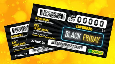 El 27 de noviembre puedes ganar un primer premio de 9 millones de euros y 6 premios distintos de 100.000 euros cada uno en el Cuponazo del Black Friday de la ONCE 2020 por el precio de 3 euros. Sumado a estos premios, también puedes ganar 15 millones de euros y otros 6 premios de 200.000 euros en el Cuponazo del Black Friday con tu Cuponazo XXL de la ONCE por 2 euros más al cupón de base, lo que ascendería a 5 euros.