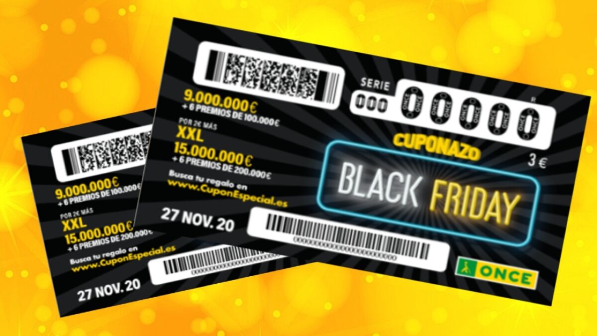 Este 27 de noviembre tienes 2.160.000 probabilidades de ganar los distintos premios del Cuponazo del Black Friday de la ONCE 2020 y cientos de tarjetas regalo de Amazon por un valor de 50 euros. Recuerda que por la compra del Cuponazo de la ONCE solo puedes acceder al primer premio de 9 millones de euros y, en el caso del Cuponazo XXL, puedes ganar 15 millones de euros por un boleto de 5 euros en el Cuponazo del Black Friday.
