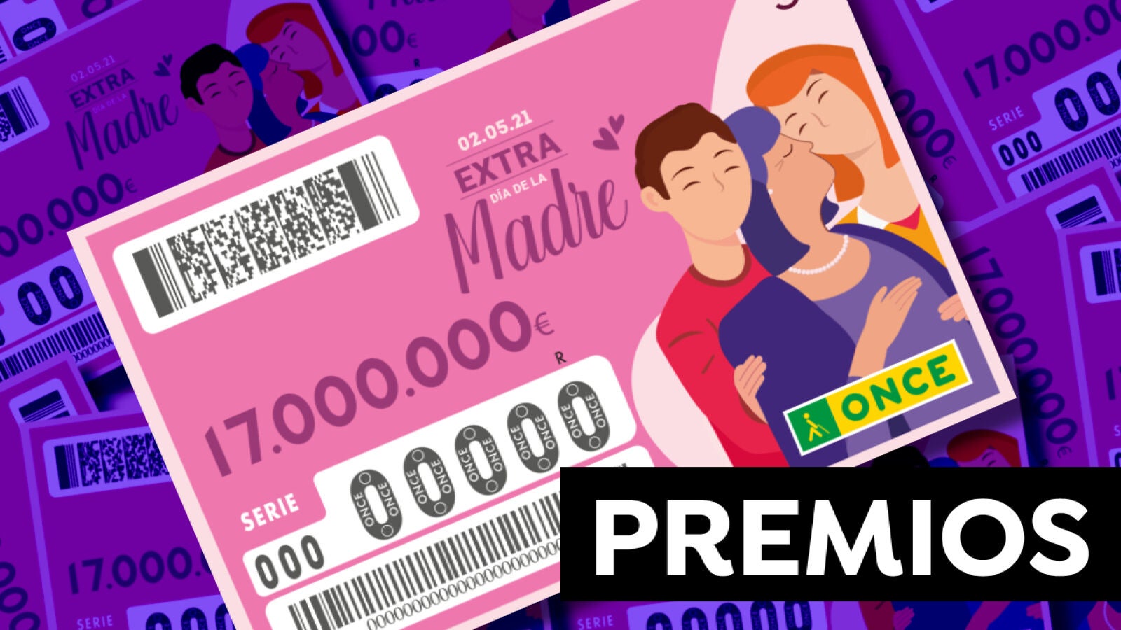 El sorteo Extra del Día de la Madre de la ONCE 2021 celebra el 2 de mayo repartiendo millones de euros. El sorteo del Extra del Día de la Madre reparte un primer premio de 17.000.000 €, 99 premios de 40.000 € a todas las series de un número de 5 cifras y 900 premios de 1.500 €.