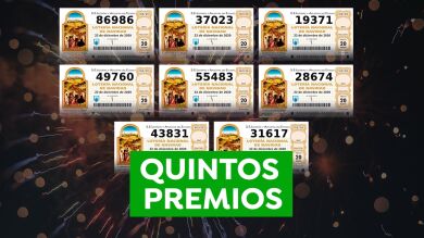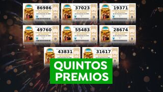 Los números 86.986, 37.023, 19.371, 49.760, 55.483, 28.674, 43.831 y 31.617 han resultado agraciados con los ocho quintos premios del Sorteo Extraordinario de Lotería de Navidad. Todos ellos están dotados con 60.000 euros a la serie, lo que supone 6.000 euros al décimo.