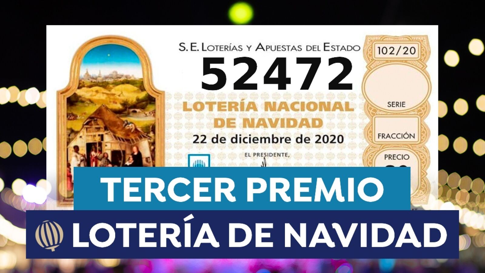 Ya conocemos el tercer premio de la Lotería de Navidad 2020 del sorteo de hoy, martes 22 de diciembre. El número 52.472 ha sido agraciado con un premio de 50.000 euros al décimo del Sorteo Extraordinario de Navidad.