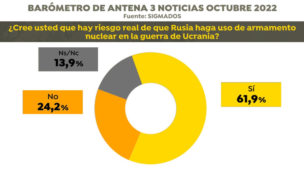 El temor a que Rusia utilice armas nucleares en la guerra que mantiene con Ucrania se hace cada vez más evidente en Occidente. En España, casi un 62% de ciudadanos considera real el riesgo a que los rusos recurran a este tipo de arsenal para ganar el conflicto, según una encuesta de Sigma Dos para Antena 3 Noticias. Solo el 24,2% cree que esto no va a ocurrir.
